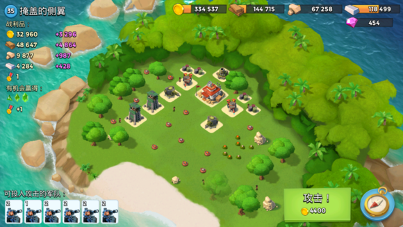 1野人,炸掉两个大加,右侧登陆,震爆打掉右侧4个防御,引导打掉左侧防御,再安心推本