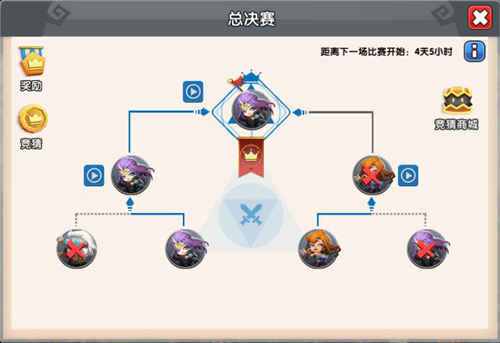 一种全新的PVP玩法锦标赛即将上线。每周四天梯赛排行前32名的玩家将进入锦标赛进行角逐,赛制为淘汰赛,前三轮为BO1,半决赛以及决赛为BO3,经过5轮的强强对决,最终将产生PVP之王。除此之外,未进入锦标赛的玩家可参与赔率竞猜,竞猜成功后将得到丰厚的回报。