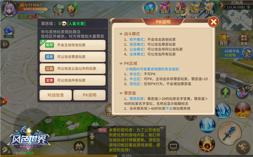 不过“友谊第一,切磋第二”一直是《风色世界》所提倡的,所以在游戏中加入了“罪恶值”的设定:在中立区主动击杀罪恶值小于40的良善玩家,罪恶值会+10;击杀罪恶值大于40的玩家不会增加罪恶值。当罪恶值大于20后,玩家将变成黄名;超过40则将变成红名,并且还会加大死亡后的惩罚,凌晨进行野外挂机也将不再受系统保护。玩家只能靠持续在线或者使用道具“清心果”来减少罪恶值。